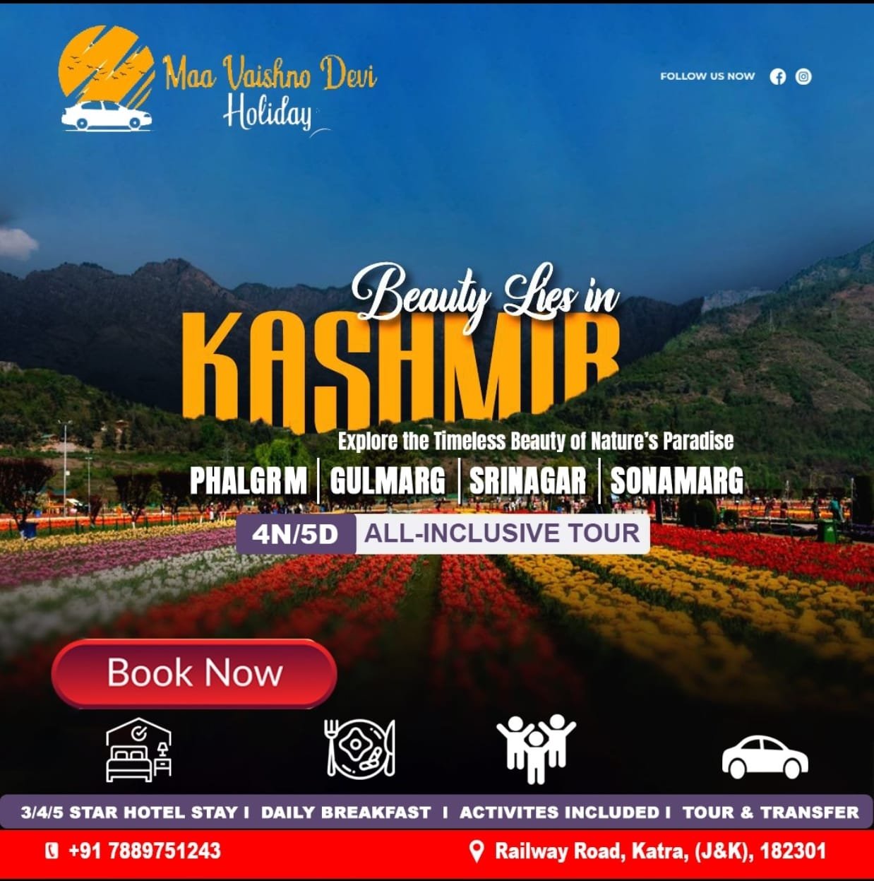 Welcome to Maa vaishnoDevi Holidays Tour and Travel – your travel agency in jammu & Kashmir since 2010! Explore our customized jammu & Kashmir ” Himachal pardesh” Leh & Ladakh” 5 Devi Tour ” Amritsar ” 4 Dham Tour Hills Station tour packages, reliable taxi services, exciting activities like Manali & Gulmarg Gondola, Shikara rides, seamless hotel reservation, and Dal Lake houseboat booking.